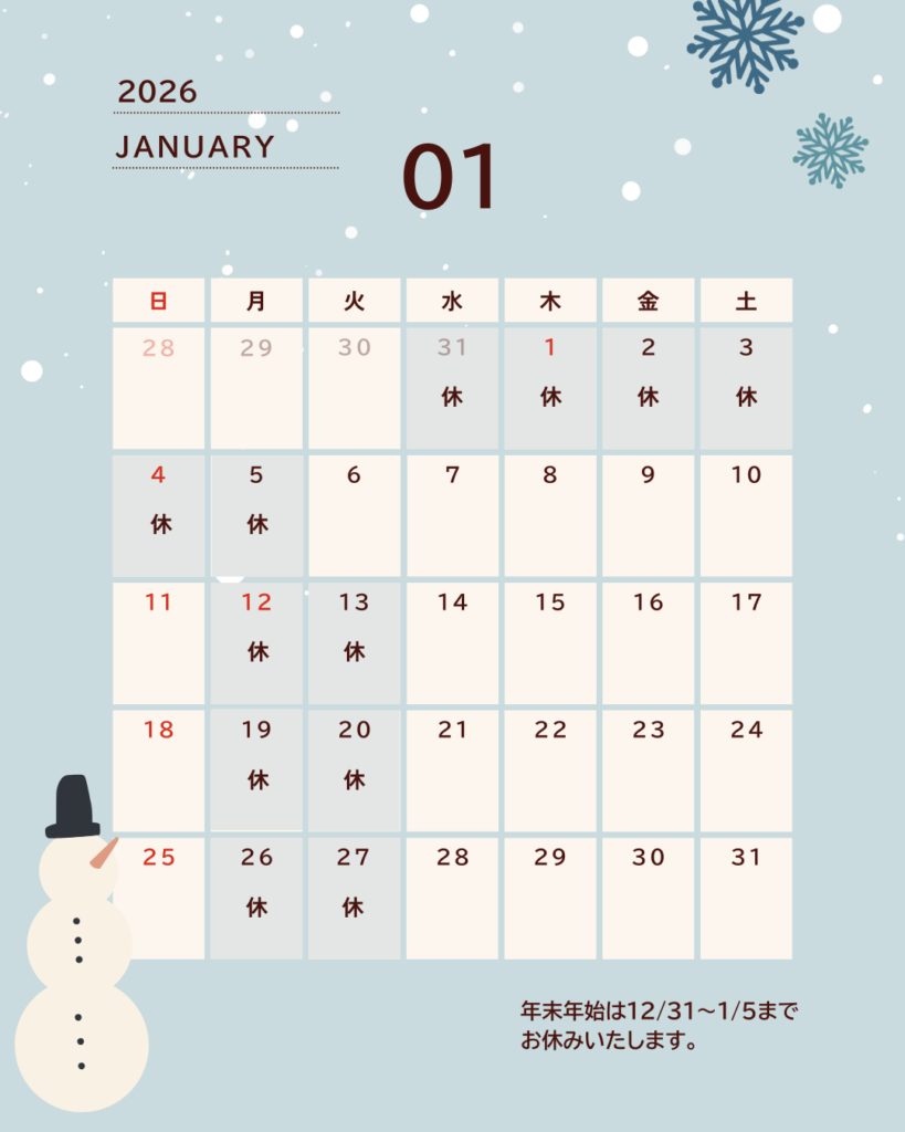 1月のお休みは下のカレンダーをご覧ください。 年末年始は12月31日〜1月5日までお休みいただきます。 よろしくお願いいたします。 ◾️焼鳥2-61 〒120-0034 東京都足立区千住2丁目61 平野ビル 1階 ☎︎03-6806-2205