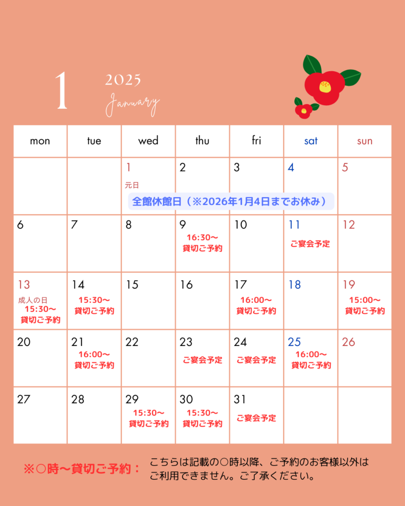 1月の営業時間は下のカレンダーをご覧ください。貸切のご予約が入っているお時間帯は当日のご利用ができません。