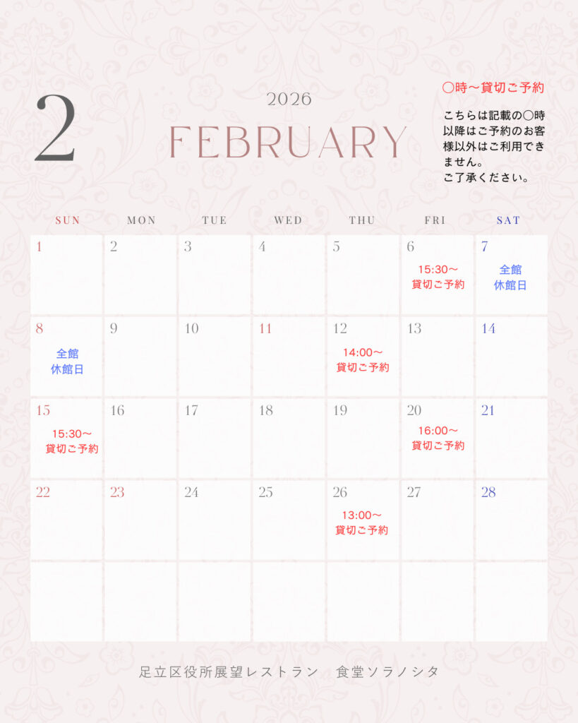 2月の営業時間は下のカレンダーをご覧ください。貸切のご予約が入っているお時間帯は当日のご利用ができません。