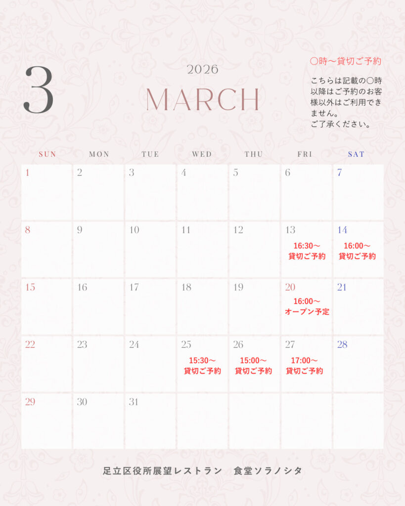 3月の営業時間は下のカレンダーをご覧ください。貸切のご予約が入っているお時間帯は当日のご利用ができません。